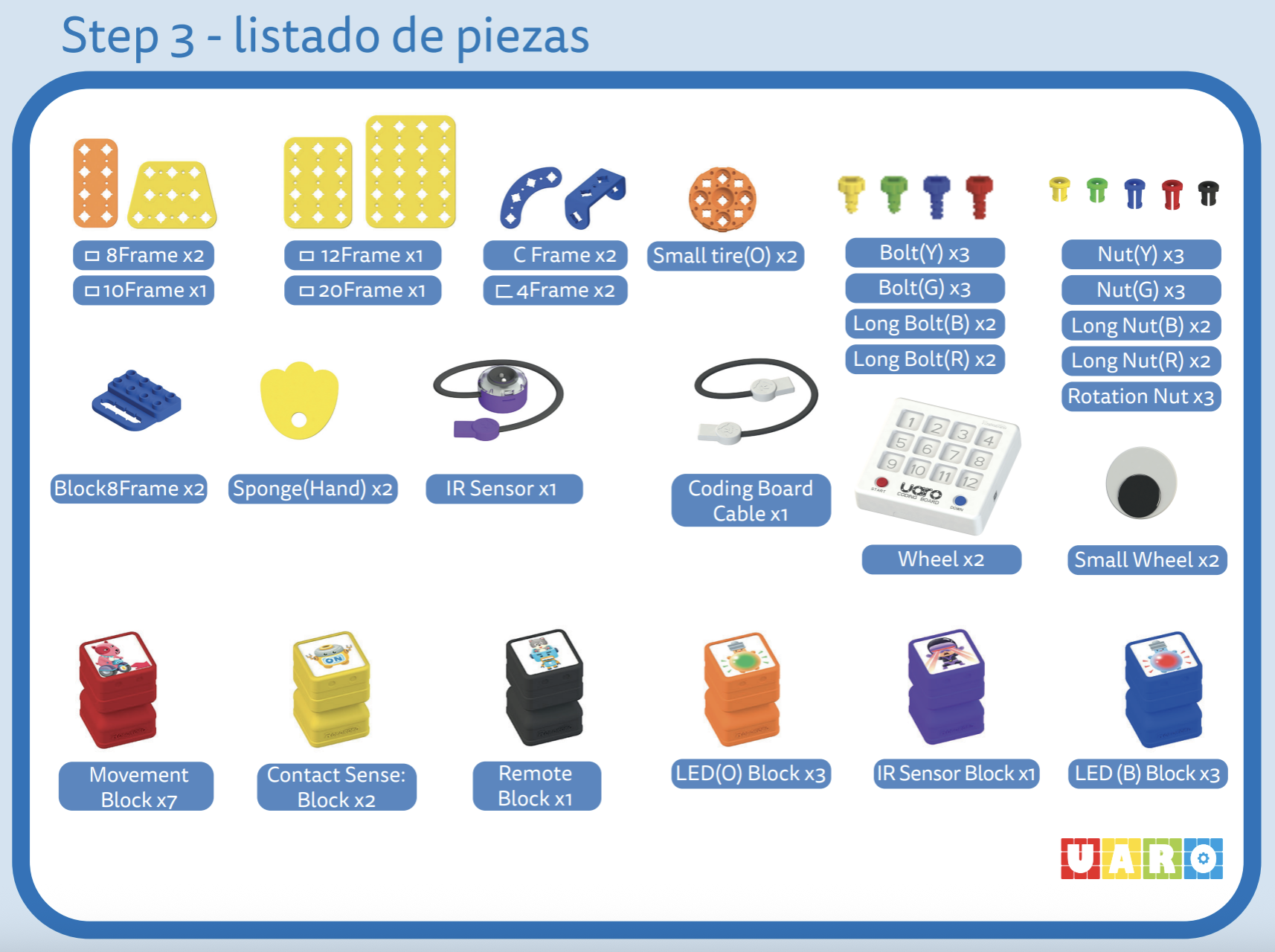 En UARO Step 3 los niños comienzan a programar utilizando bloques físicos de programación que se colocan en un tablero especial.